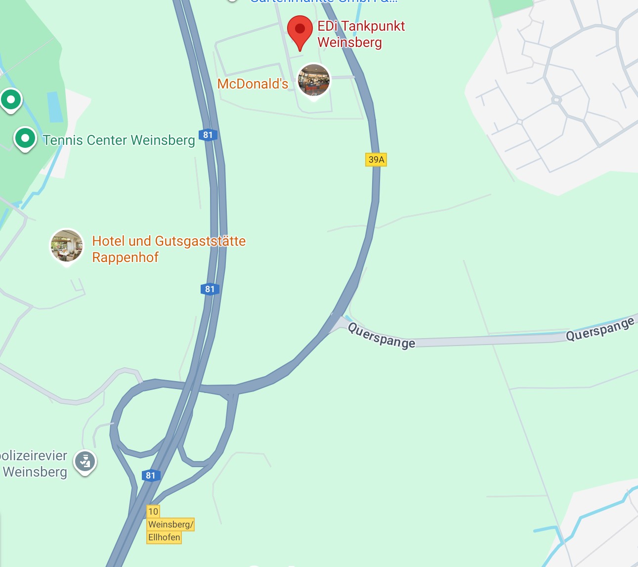 Treffpunkt: 9:45 Uhr an der Edi-Tankstelle Am Autobahnkreuz 6, 74189 Weinsberg. A81 Richtung Heilbronn Ausfahrt Weinsberg/Ellhofen. Nach der Abfahrt rechts abbiegen Richtung Weinsberg/Ellhofen. Nach ca. 800m links abbiegen ins Industriegebiet Am Autobahnkreuz.